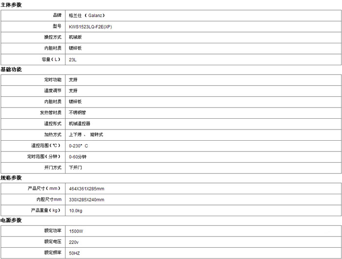 格兰仕 (Galanz) 23L电烤箱 KWS1523LQ-F2E(XP) 黑色