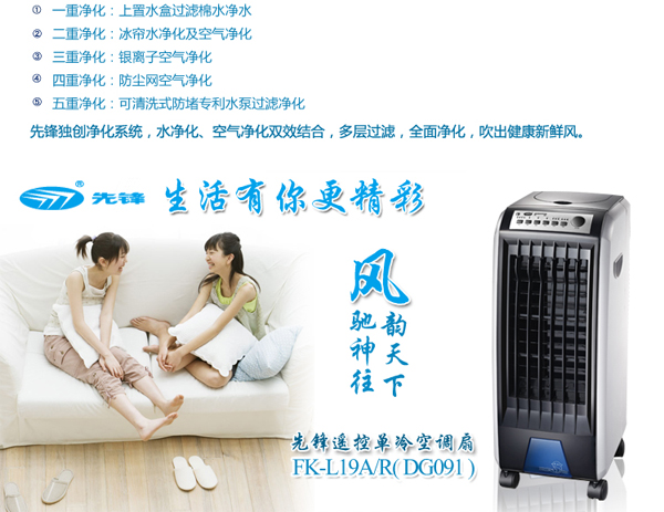 先锋空调扇DG091为单冷型机器,不可制热,适合夏季使用。控制开关,三种风类选择,三档可调,用户可根据自己的实际需要选择。内部先锋专用绿色的水帘,采用绿色环保竹炭纤维材料制作,可有效的降低出风口的温度,此外,这款机器还可以通过循环水来过滤空气,水净化空气净化双效结合多层过滤全面净化,吹出健康新鲜风。内置冷触媒,可有效的杀菌和防臭,全面净化空气。
