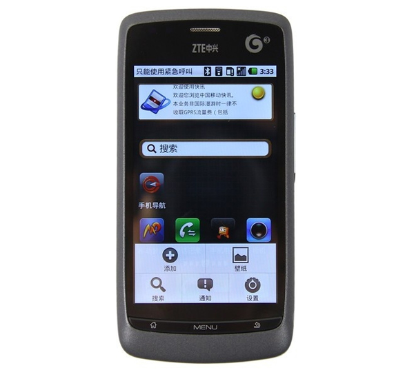 中兴U880外观非常简洁,采用直板触控的设计,主打的就是刀锋造型,机身看起来纤薄小巧,整机流线感很强。三围114x56.6x11.8毫米的比较的适中,感觉不会非常的沉重。机身为深灰色,只有屏幕周边用黑色装饰。边角采取圆弧处理,是这款手机显得非常圆润、柔和。中兴U880采用的是3.5WVGA分辨率的屏幕,显示效果还是比较细腻的。