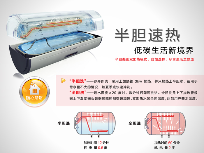 阿里斯顿AL50SH2.5INC3电热水器具有速热全胆和速热半胆等加热方式,以创新低位匀速进水,通过内置温控智能控制速热程序,短时间内将整胆水加热至设定温度,无需长时间等待。 “半胆洗”--即开即洗,采用上加热管3KW加热,并只加热上半胆水,适用于需水量不大的情况,如夏季或快速冲洗。“全胆洗”--进水温度≥20度时,数分钟后即可洗浴。全胆洗是上下加热管根据上下温度探头数据智能控制交替价额,实现热水器全胆温度,达到用户需水温度。
