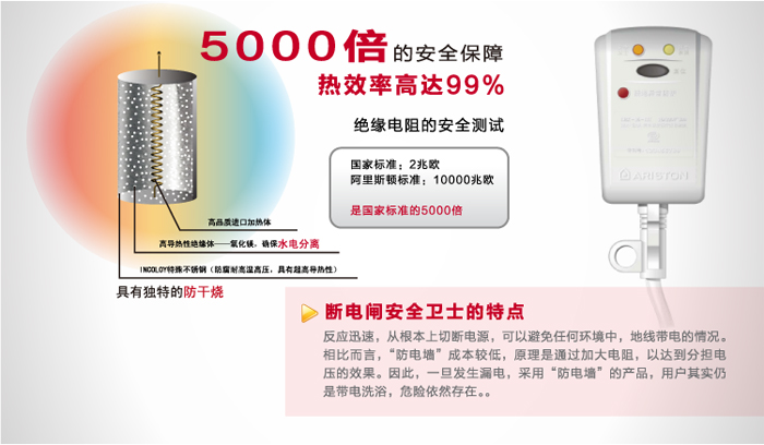 阿里斯顿AL50SH2.5INC3电热水器反应迅速,从根本上切断电源,可以避免任何环境中,地线带电的情况。