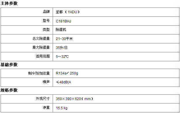 编辑评价:亚都(YADU)C181BHJ 除湿机还有湿度显示、水箱水满提示,自动停机保护、自动除霜等功能,功能强大,使用方便,呵护您与家人的健康!