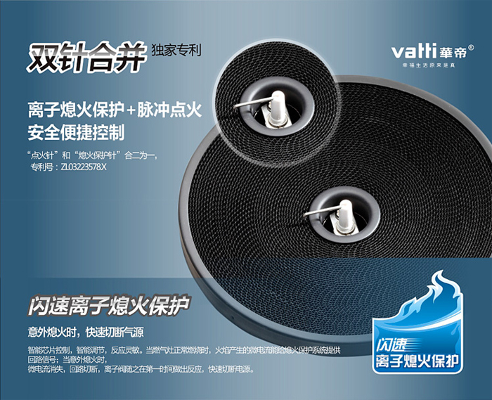 华帝JZT- i10003C燃气利用火焰导电原理,当灶具正常燃烧时,火焰产生微电流给熄火保护系统提供回路信号;电脑芯片每6秒自动检测1次,一旦发生意外熄火,微电流消失,离子针0.1S感应并迅速关闭气源(5-8S 人性化延时),安全升级。