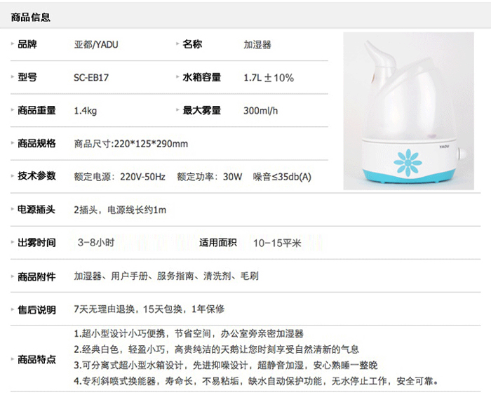 水上天鹅:亚都(YADU)SC-EB17加湿器