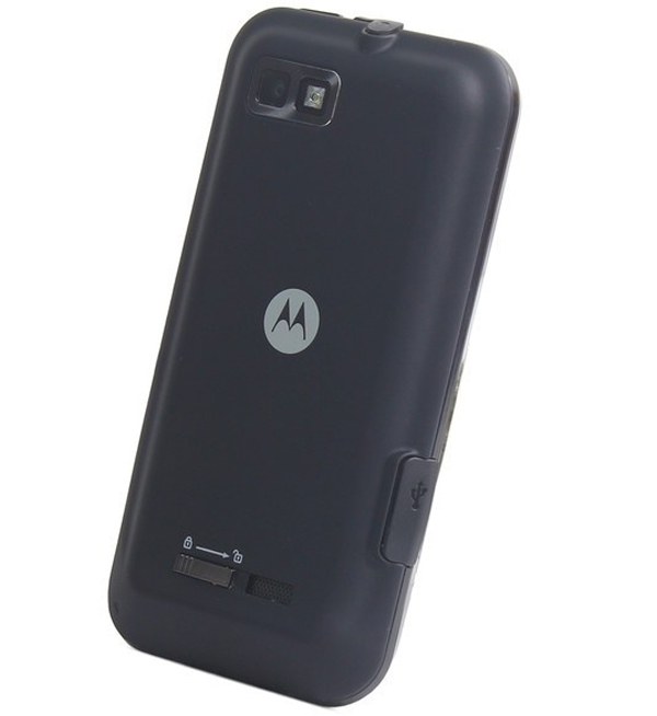 摩托罗拉XT535背面手感和材料与之前ME525类似,最显眼的就是我们很熟悉的后盖锁了,锁上之后就会让后盖更紧实地和机身闭合,防止水侵入手机内部。