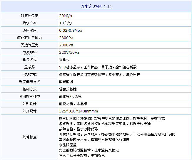 万家乐JSQ20-10JP燃气热水器采用天然气为燃烧气源,清洁又节能。该产品运用数码恒温智能控制技术,保证水温恒定。配置的进口自动分段高精度燃气比例阀,精确调配燃气与空气比例,让燃气燃烧更充分。