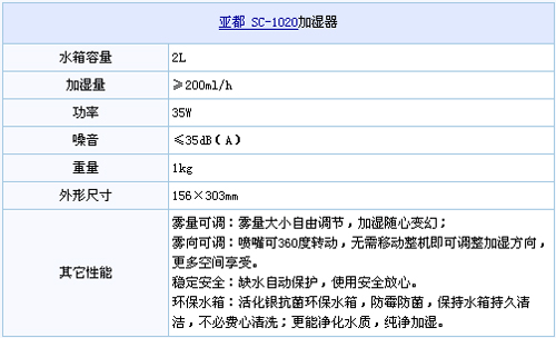 亚都SC-1020加湿器进风口处设有炭银进风网,在在活性炭过滤网上涂覆活化银,消除进风口空气中的细菌、灰尘、异味等,雾气更洁净。这款加湿器还拥有涡轮增压静音风机,在保证风力充足的情况下,还能降低运行时的噪音,达到水雾上扬角度更高,加湿的效果更好。带有缺水自动保护功能,不必担心因缺水而造成的意外事故,使用更安心。这款加湿器使用了活化银抗菌环保水箱,防霉防菌,保持水箱持久清洁,不必费心清洗,更能净化水质,纯净加湿。斜式喷嘴设计外加载银散热片散热快,能够更好的延长使用寿命,同时有全面的杀菌功能,不沾垢,易清洗。