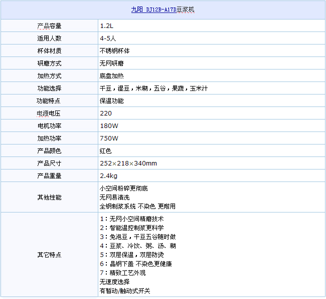 编辑评价:九阳DJ12B-A17D豆浆机外观设计时尚美观。双层杯体结构防烫降噪。功能比较齐全,轻松制作豆浆、冷饮、粥、汤、糊等。这款产品属于市场中销售较好的产品,十分适合大众家庭选购。