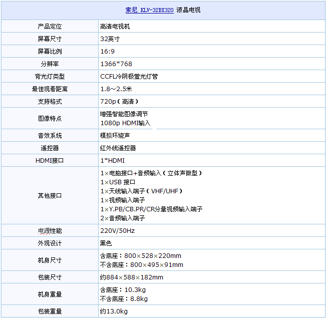 索尼(SONY) 32英寸 LCD电视 KLV-32BX320 黑色