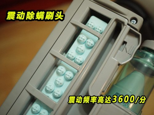 第二代震动刷头:该刷头可以通过高频震动对床褥、窗帘等织物表面进行清洁拍打,有效将螨虫或细菌与组织物分离,值得一提的是,该刷头特别配备了真空的小集尘盒,有效的保障了细菌存储的密封性。