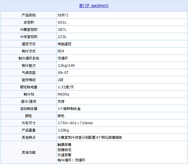 评测总结:西门子KA62NV40T拥有豪华的外观设计,双循环风冷系统、超大的610L容量,超节能的更是这款产品的一大亮点。另外,这款冰箱的功能配置也相当齐全,电脑控温、抗菌材料、无霜功能,可以为用户带来最大的便利。