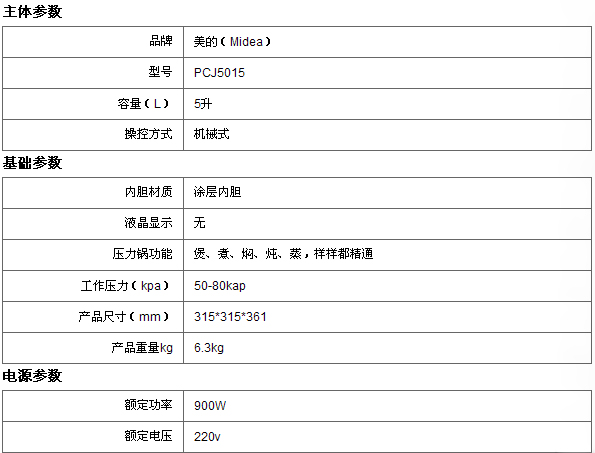 编辑评价:美的PCJ5015电压力锅有停电记忆 使用方便又省心,烹饪结束自动进入保温状态,不建议长时间保温。高效节能间歇式加热,不排气,热量不流失。