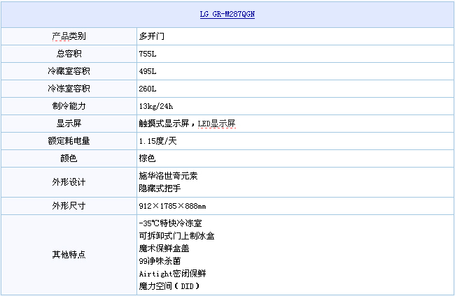 编辑评价:LG GR-M287QGN对开门冰箱市场定位高,外观尊贵大气,让你第一眼就爱上它。755L的超大容积,完全能够满足一个多口之家的使用需求。喜欢的朋友一定要多加关注哦。