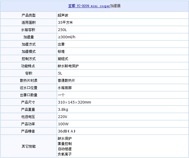 编辑评价:亚都YC-D209 mini cooper加湿器外观比较普通,采用超声波制雾加湿方式,5L箱体容量,适合35平米的加湿环境。有兴趣的朋友不妨关注一下。