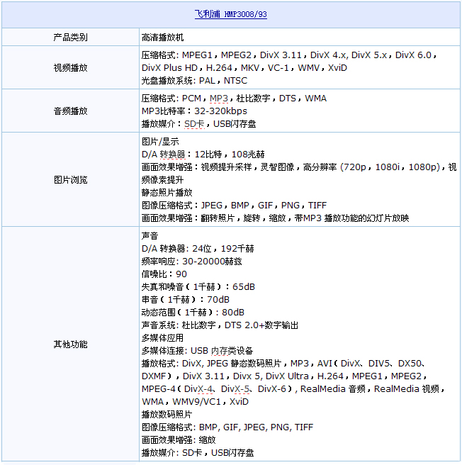 飞利浦HMP3008/93高清播放机DivX Plus HD支持DivX Plus 内容播放,同时还支持上一版本的 DivX 视频,分辨率最高可达 1080p,是真正的高清数字视频。飞利浦HMP3008/93可以播放播放并享受全方位的视频格式 — 高清格式,如 MPEG 1/2/4 (MPEG 4 Part 2)、H.264、VC-1、H.263、VP6 (640 x 480)、DivX Plus HD、DivX 3/4/5/6、Xvid、RMVB 8/9/10、RM、WMV (V9)、AVI、TS、M2TS、TP、TRP、ISO、VOB、DAT、MP4、MPEG、MPG、MOV(MPEG 4、H.264)、ASF、FLV (640 x 480)、MKV、M4V,绝对免去您转换文件的烦恼。只需按播放即可以非凡的影院级品质和逼真的环绕音效欣赏视频或电影。支持 RealMedia Video,可播放电脑上的影片。飞利浦HMP3008/93还能够很好的播放音乐,可让您轻松访问多种音频格式,如杜比数字、AAC、RA、OGG、 MKA、MP3、WAV、APE、FLAC、DTS、LPCM、PCM、WMA (V9)、IMP/MS ADPCM 和 WMA Pro。