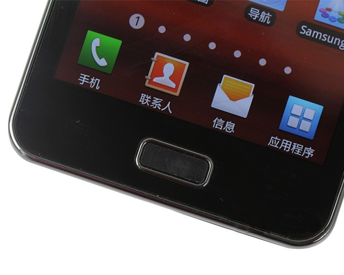 三星I9103的正面底部为标准的“三星式”设计,HOME键两旁的触控按键在没有背光灯的衬托下,可以很好的得到了隐藏。