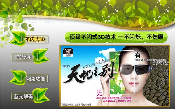 2.可视角度广,观看不闪式3D电视时只要是在推荐距离内,在任何角度观看,它的画面效果、色彩表现力都不打折扣,可以在没有角度限制的情况下去享受完美震撼的3D影像。