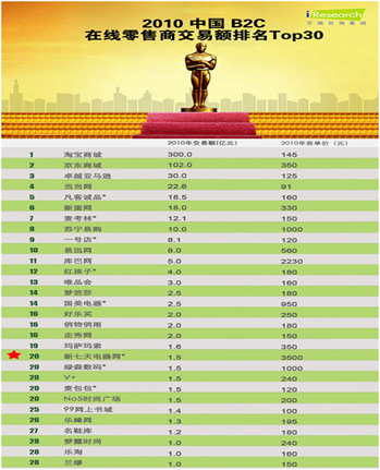 2010年中国B2C在线零售交易排名TOP30
